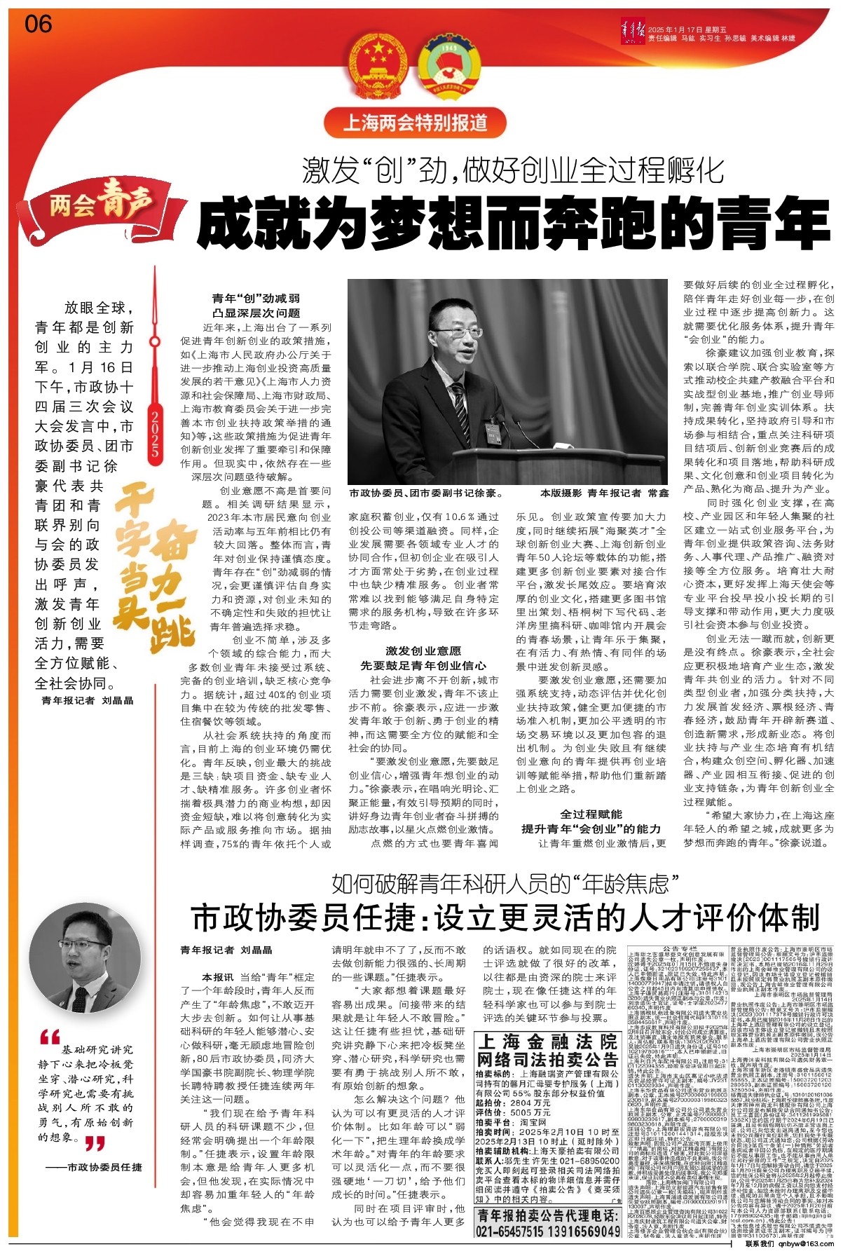 放眼全球,青年都是创新创业的主力军。1月16日下午,市政协十四届三次会议大会发言中,市政协委员、团市委副书记徐豪代表共青团和青联界别向与会的政协委员发出呼声,激发青年创新创业活力,需要全方位