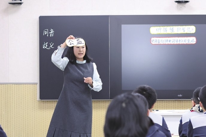 “我表达的是‘工艺展品’,但语音识别系统却识别为‘公益展品’,为什么机器会产生这样的误判?”课堂上,周洋阳从创设的真实情境入手,引导学生思考和解决问题。这节课,她想让学生理解人工智能非常底层的一个概念——“冗余”,但在课堂导入环节,她却通过语文课的“同音词歧义”案例分析展开,让学生去寻找解决“歧义”的方法。通过多轮互动、学习,学生们渐渐理解了词汇、标点符号、断句和上下文,这些“额外的元素”让语音更易于被人类和机器理解。周洋阳告诉同学们,这是人用“冗余”去解决歧义的一种方法,而机器也是用类比人的思维去做的。