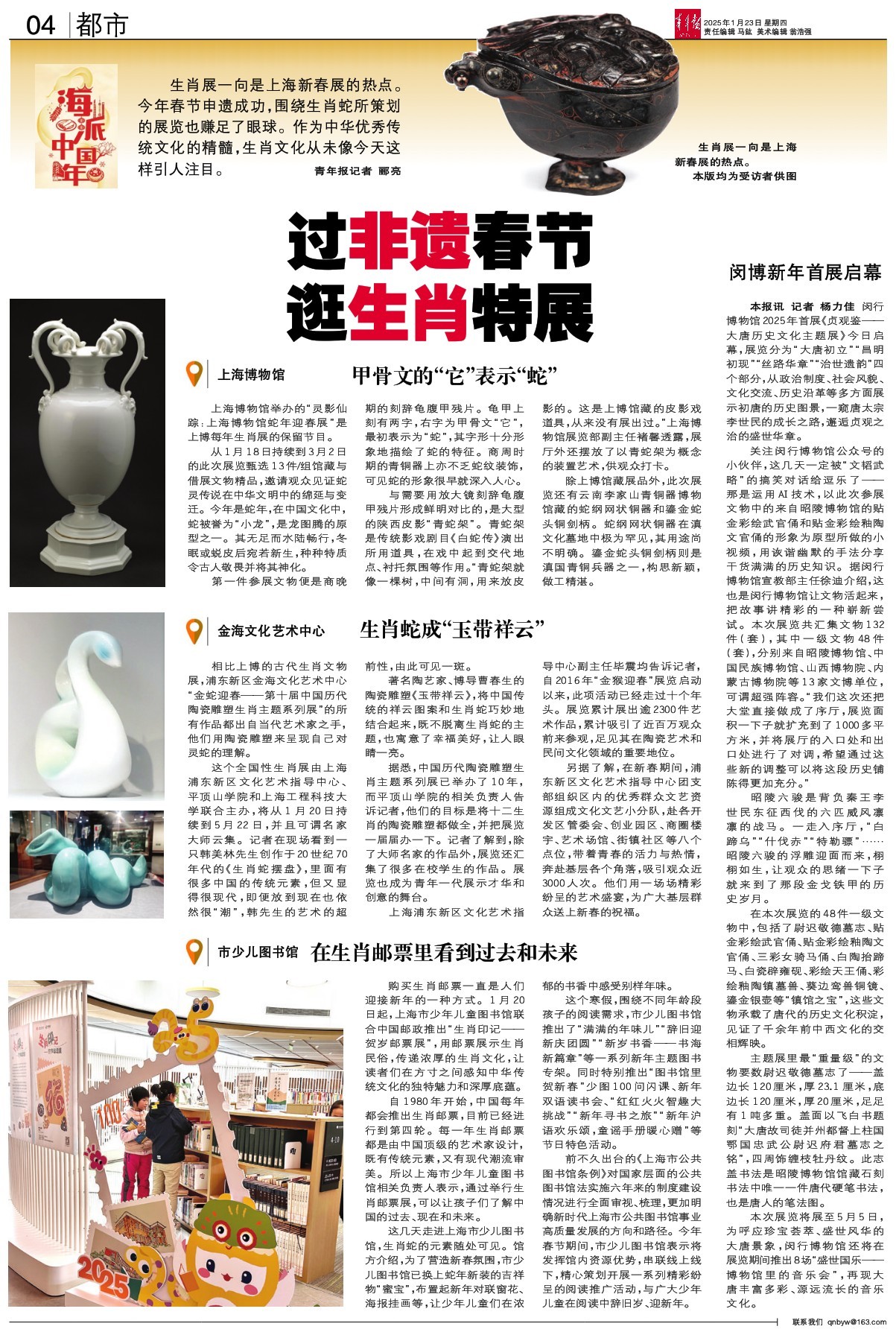 生肖展一向是上海新春展的热点。今年春节申遗成功,围绕生肖蛇所策划的展览也赚足了眼球。作为中华优秀传统文化的精髓,生肖文化从未像今天这样引人注目。 青年报记者 郦亮 上海博