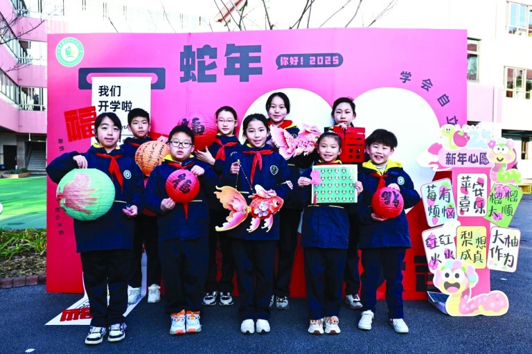 开学第一天,政立路小学的学生们都带着“蛇舞新春 艺承未来”民俗创意作品入校。“这幅画是我自己画的,DeepSeek给我提供了一些灵感和颜色上的建议。如告诉我如何配色,它建议我把蛇画成绿色的,然后画一些金色的鞭炮作为点缀。”一名三年级学生介绍说,和AI对话,就像有一个好朋友适时提出意见和看法,而不是直接给出答案。