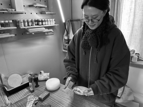 记者看到有若干个陶艺半成品被整整齐齐地排列在架子上,上面还标有不同的日期。原来,这些都是之前来体验陶艺制作的爱好者留下的,等它们晾干后就可以上色了。章老师告诉记者,中心拥有较全的手工陶艺制作工具和设备,如拉坯机、练泥机、泥板机等,还配备了多种陶艺的烧成方式,不仅会定期举办各类陶艺培训课程、工作坊和讲座,还会与其他地区的陶艺中心、艺术家和手工艺人进行交流与合作,共同推进“陶艺生活化,生活艺术化”这一美好愿景。