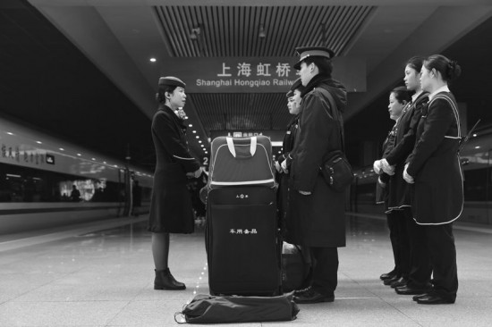 周昕蓓值乘的上海虹桥-重庆西G1333次列车每天11点44分从虹桥站始发,作为列车长,她9点左右就来到单位,开始一系列的准备工作。“先组织班组成员开一个出发前的小会,10点车队干部会来给我们开出发会议。”10点30分,周昕蓓进入值班室,完成点名、查看仪容仪表、业务抽问等流程环节。10分钟后,她来到站台上,准备接车。此时,保洁、餐车等人员已经就位,周昕蓓在站台上给他们交代各种注意事项:“我们今天值乘的是由上海虹桥站开往重庆西站的G1333/1336次列车,对于小朋友要做好安全提醒,开水不要让小朋友自己接……”