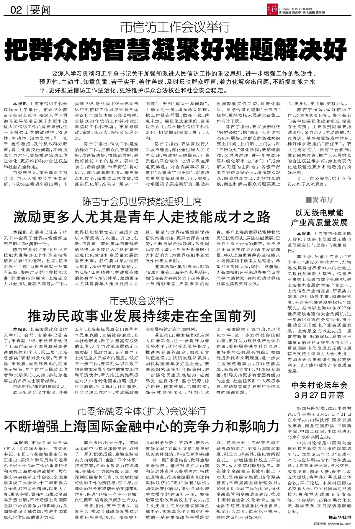 龚正指出,要干字当头、奋发有为,推动金融改革发展稳定各项任务落实落地。要在提升金融服务质效上下功夫,把深入做好金融“五篇大文章”与更好服务实体经济、科技创新和共建“一带一路”紧密结合,做好金融要素保障。精准对接扩大内需和促进外资增长各项需求,持续疏通堵点,推动金融服务加速向实体经济的“毛细血管”渗透。加快数智化转型,推进金融领域垂类模型的建设和应用。要在增强金融改革实效上下功夫,把中央支持上海加快建设国际金融中心、实施高水平金融对外开放的一系列重要改革举措落实好。持续提升上海配置全球金融资源的能力,坚持为国家试制度、测压力、探新路,强化协同配合,进一步增强整体效应、平台效应、放大效应和辐射效应。要在健全金融稳定长效机制上下功夫,坚持综合施策,强化源头管控,不断提高金融治理效能。加强党对金融工作的领导,强化金融监管和金融法治建设,推动中国特色金融文化教育。全市金融系统要持续强化行业自律、规范行为准则、筑牢职业操守,共同营造行业良好风气。