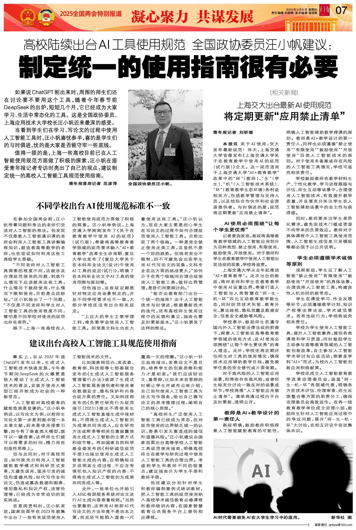 值得一提的是,上海一些高校目前已在人工智能使用规范方面做了积极的探索,汪小帆在接受青年报记者专访时亮出了自己的观点:建议制定统一的高校人工智能工具规范使用指南。