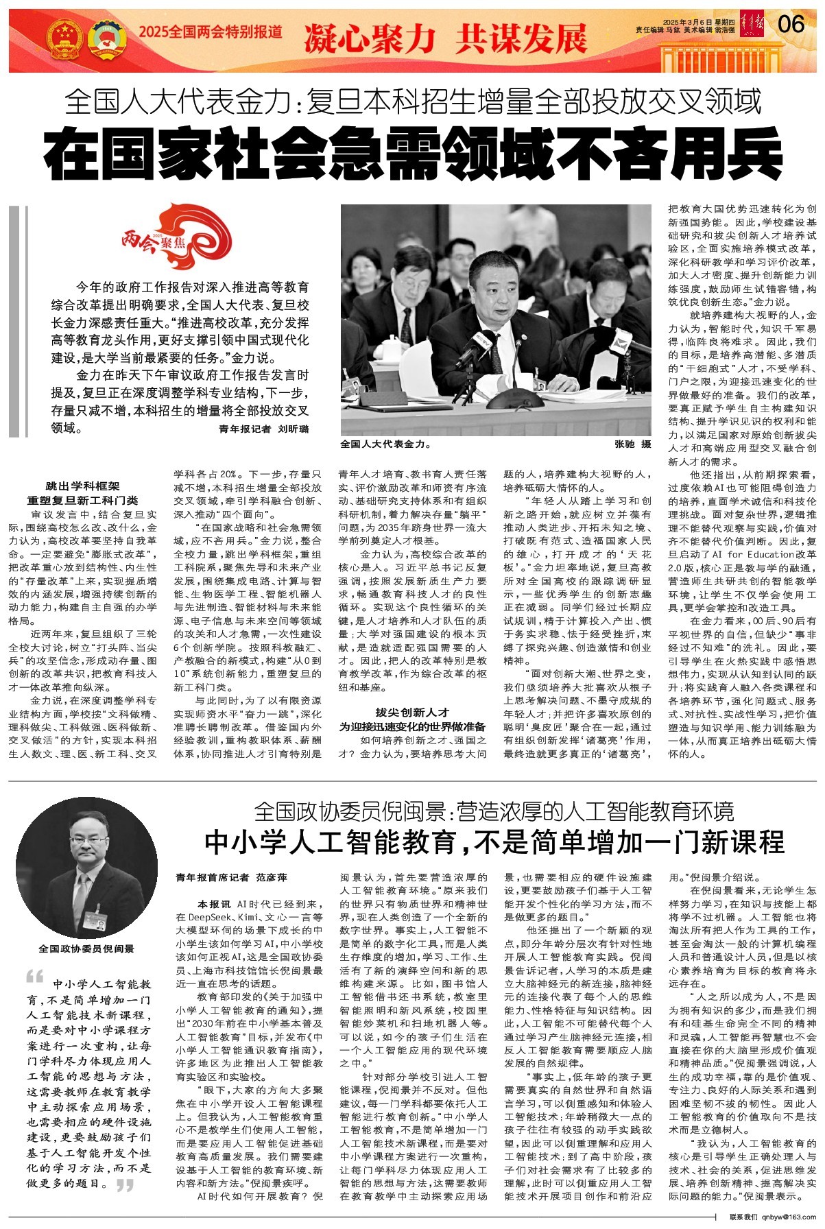 - 在国家社会急需领域不吝用兵 今年的政府工作报告对深入推进高等教育综合改革提出明确要求,全国人大代表、复旦校长金力深感责任重大。“推进高校改革,充分发挥高等教育龙头作用,更好支撑引领中国式现代化建设,是大学当前最紧要的任