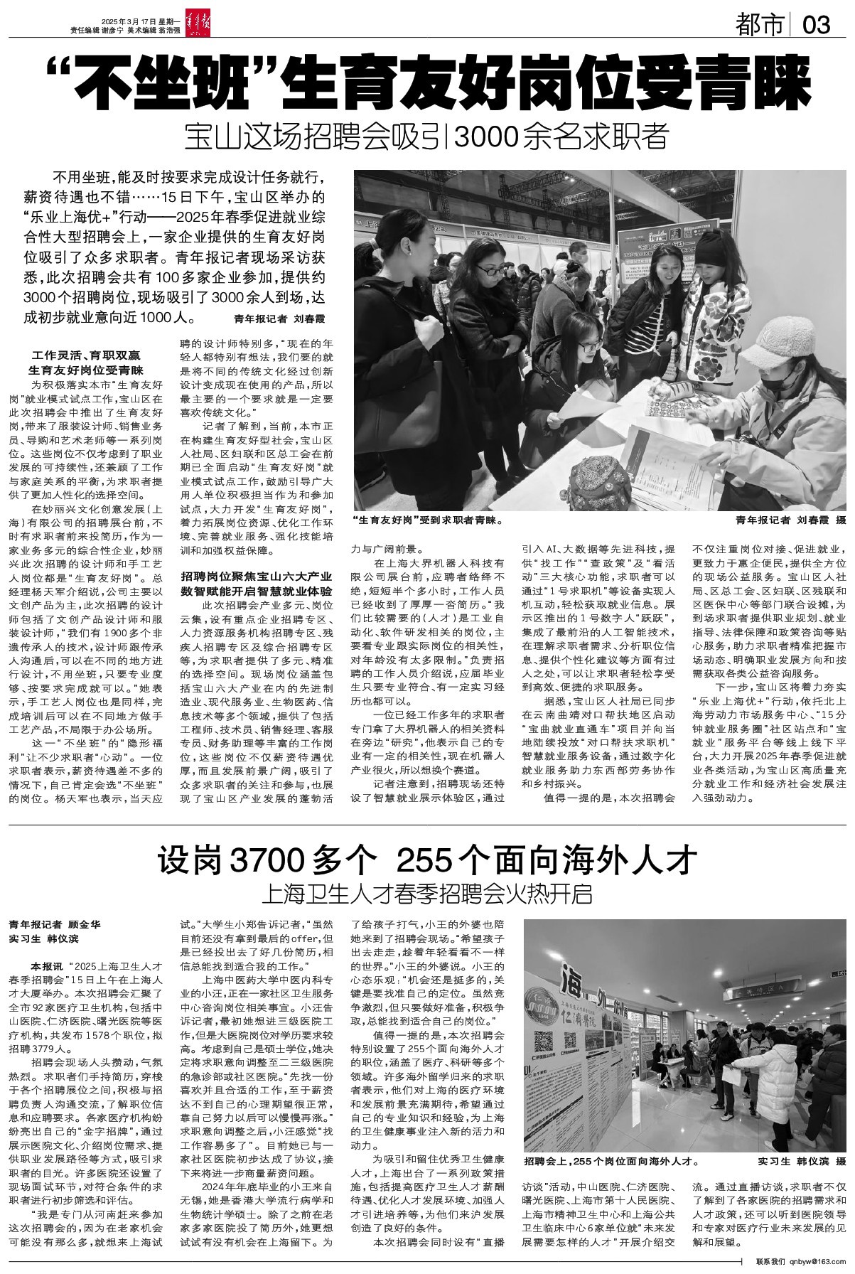 - “不坐班”生育友好岗位受青睐 不用坐班,能及时按要求完成设计任务就行,薪资待遇也不错……15日下午,宝山区举办的“乐业上海优+”行动——2025年春季促进就业综合性大型招聘会上,一家企业提供的生育友好岗位吸引了众多求职者