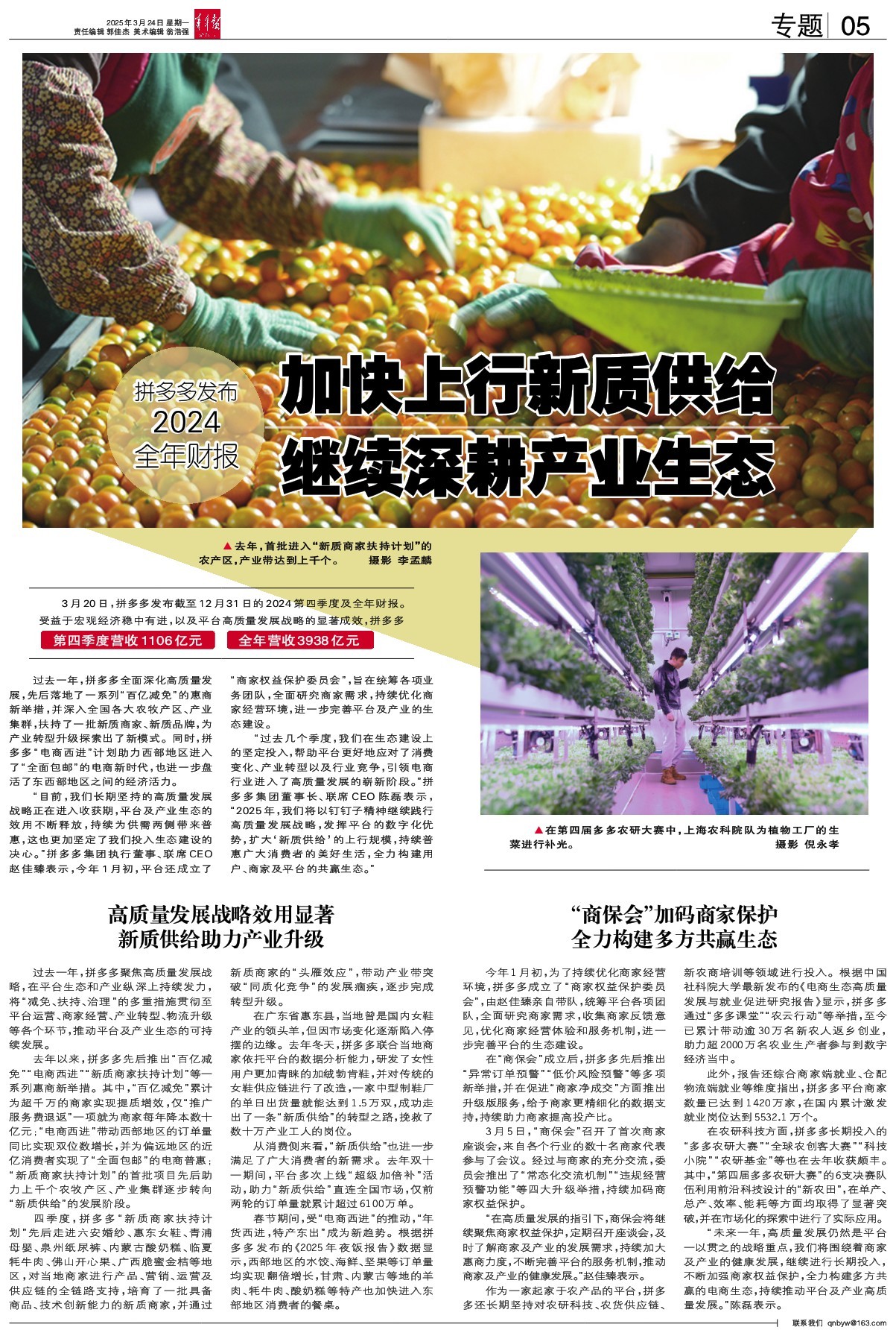 3月20日,拼多多发布截至12月31日的2024第四季度及全年财报。受益于宏观经济稳中有进,以及平台高质量发展战略的显著成效,拼多多第四季度营收1106亿元,全年营收3938亿元。