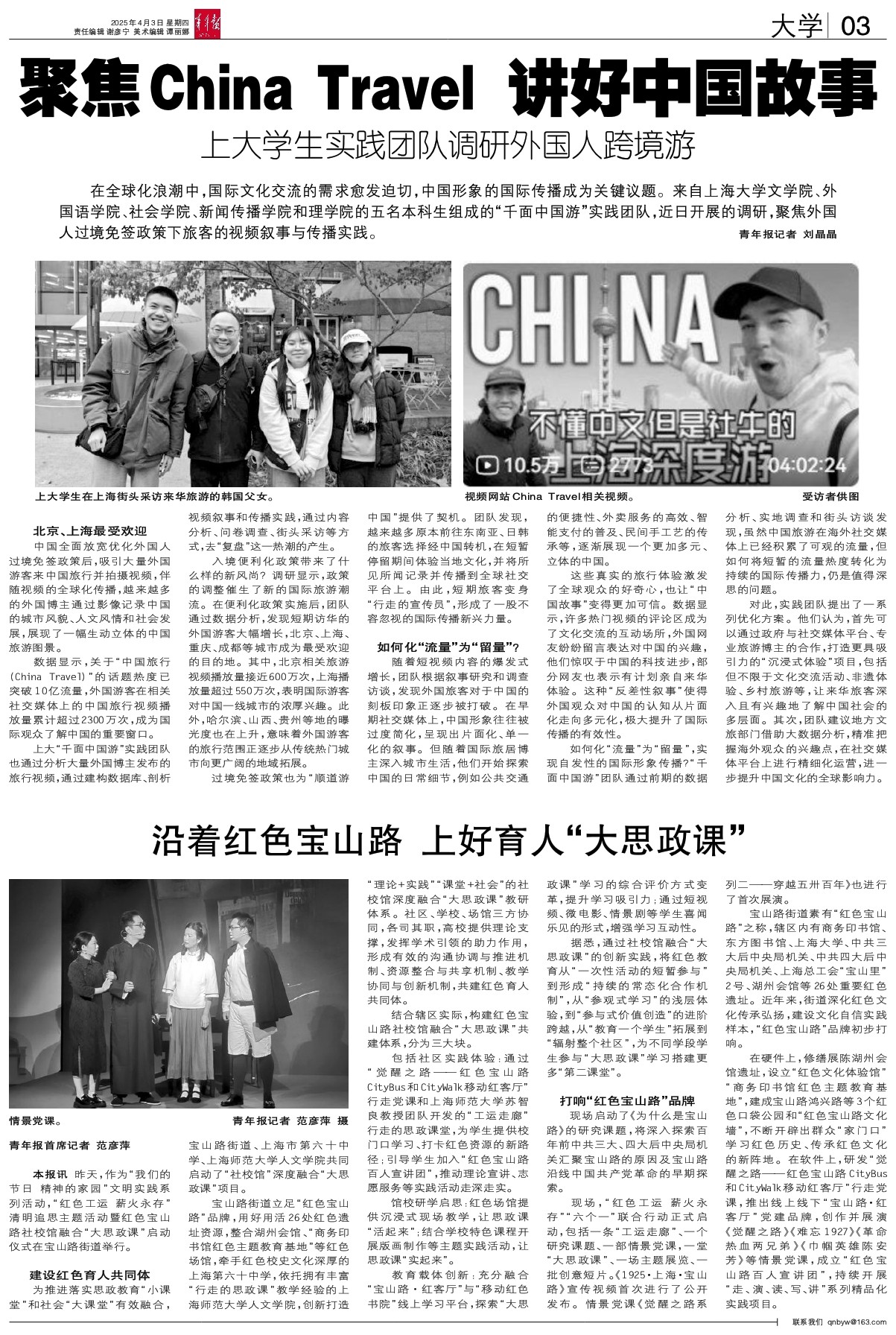 - 聚焦China Travel 讲好中国故事 在全球化浪潮中,国际文化交流的需求愈发迫切,中国形象的国际传播成为关键议题。来自上海大学文学院、外国语学院、社会学院、新闻传播学院和理学院的五名本科生组成的“千面中国游”实践团队,近日开展的
