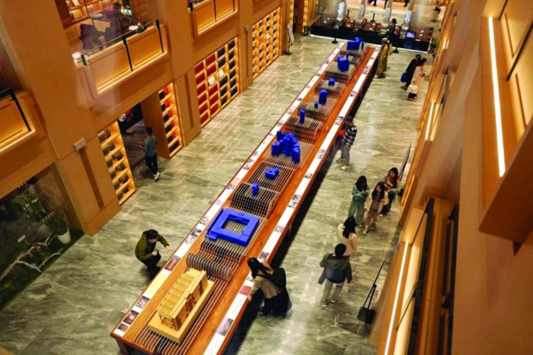 其中,“往昔Art Deco建筑”展区位于徐家汇书院中庭,精选赛华公寓、毕卡第公寓、华盛顿公寓、上海交大工程馆等上海徐汇衡复风貌区的经典建筑,以模型形式呈现。底座通过Art Deco的形式语言,将江南水乡园林中的桥、菱窗等要素进行转译与表达,形成江南文化托举摩登生活的总体意象,是对上海文化历史的艺术化表达,也是对海派文化的一种建筑学诠释。