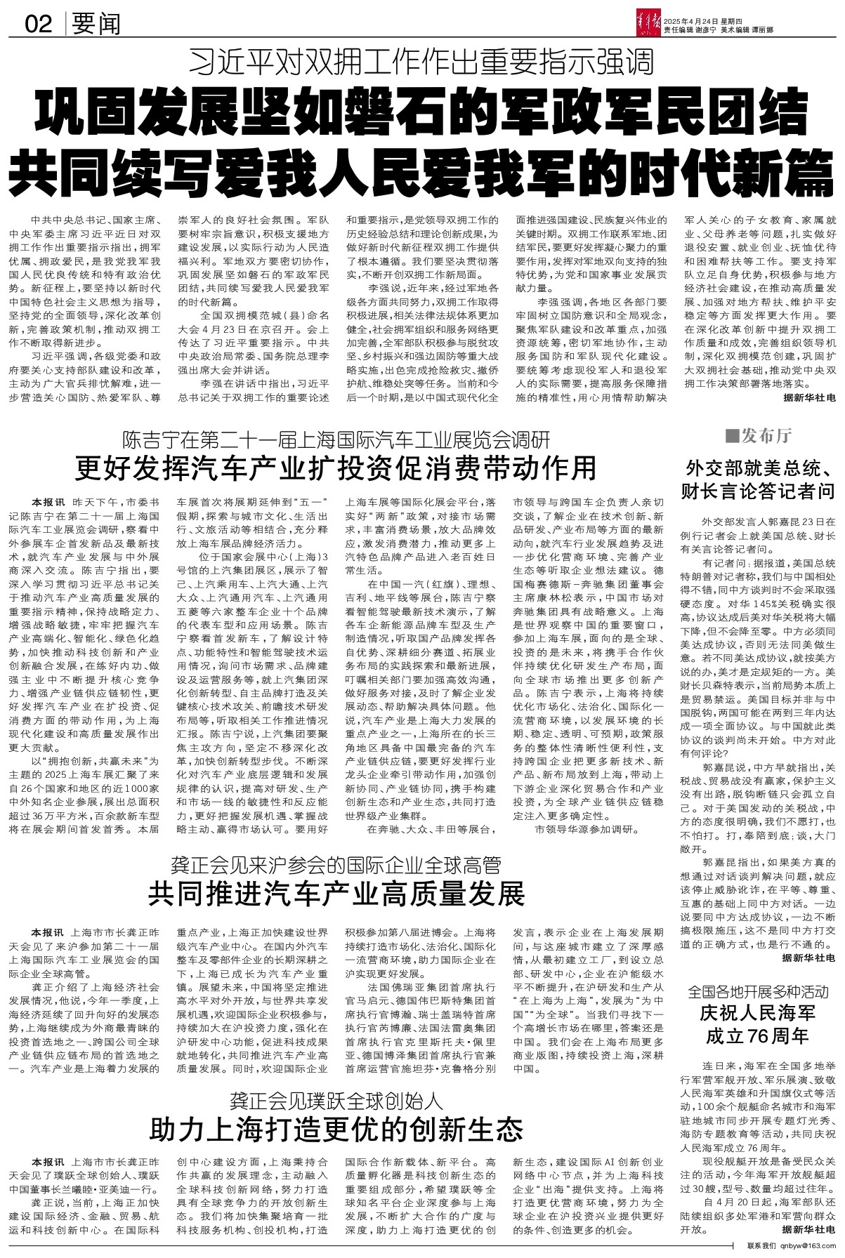 - 更好发挥汽车产业扩投资促消费带动作用 本报讯 昨天下午,市委书记陈吉宁在第二十一届上海国际汽车工业展览会调研,察看中外参展车企首发新品及最新技术,就汽车产业发展与中外展商深入交流。陈吉宁指出,要深入学习贯彻习近平总书记关于推动汽