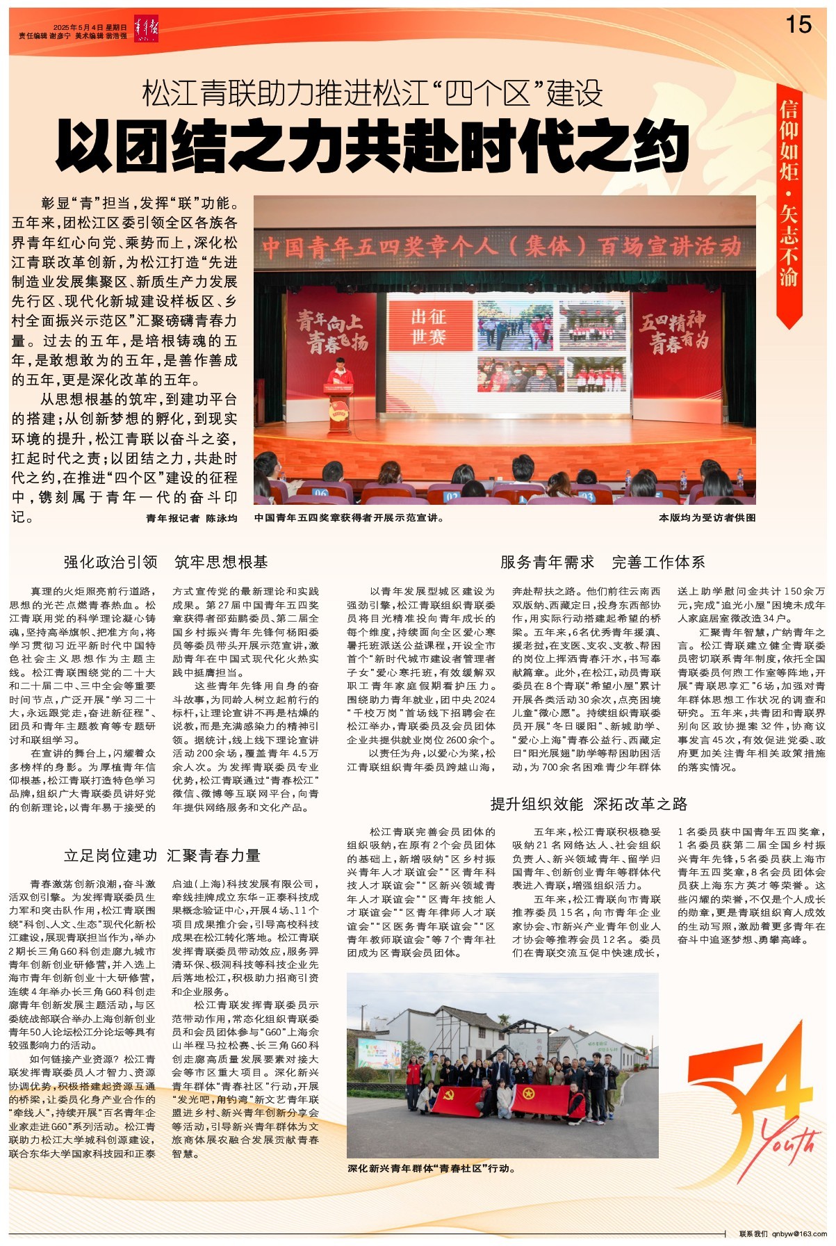 彰显“青”担当,发挥“联”功能。五年来,团松江区委引领全区各族各界青年红心向党、乘势而上,深化松江青联改革创新,为松江打造“先进制造业发展集聚区、新质生产力发展先行区、现代化新城建设样板区、