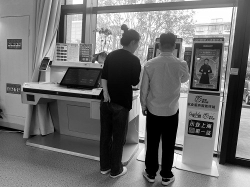 在宝山区淞南镇党群服务中心,全市首家智慧就业服务站点设立于此,吸引了不少市民前来咨询。据了解,这处家门口的就业服务站是宝山区“15分钟就业服务圈”的率先试点之一,通过引入自助求职机,集成了“乐业上海第一站”“宝就业”等多个公共就业服务平台。在这里,求职者只需完成刷脸登录、身份核验、信息确认三步操作,即可完成求职登记。随后,求职者可以直接将求职意向告知数字人“小ai”,依托“龙门就业大模型”,“小ai”在几秒内即可生成附近的岗位信息。
