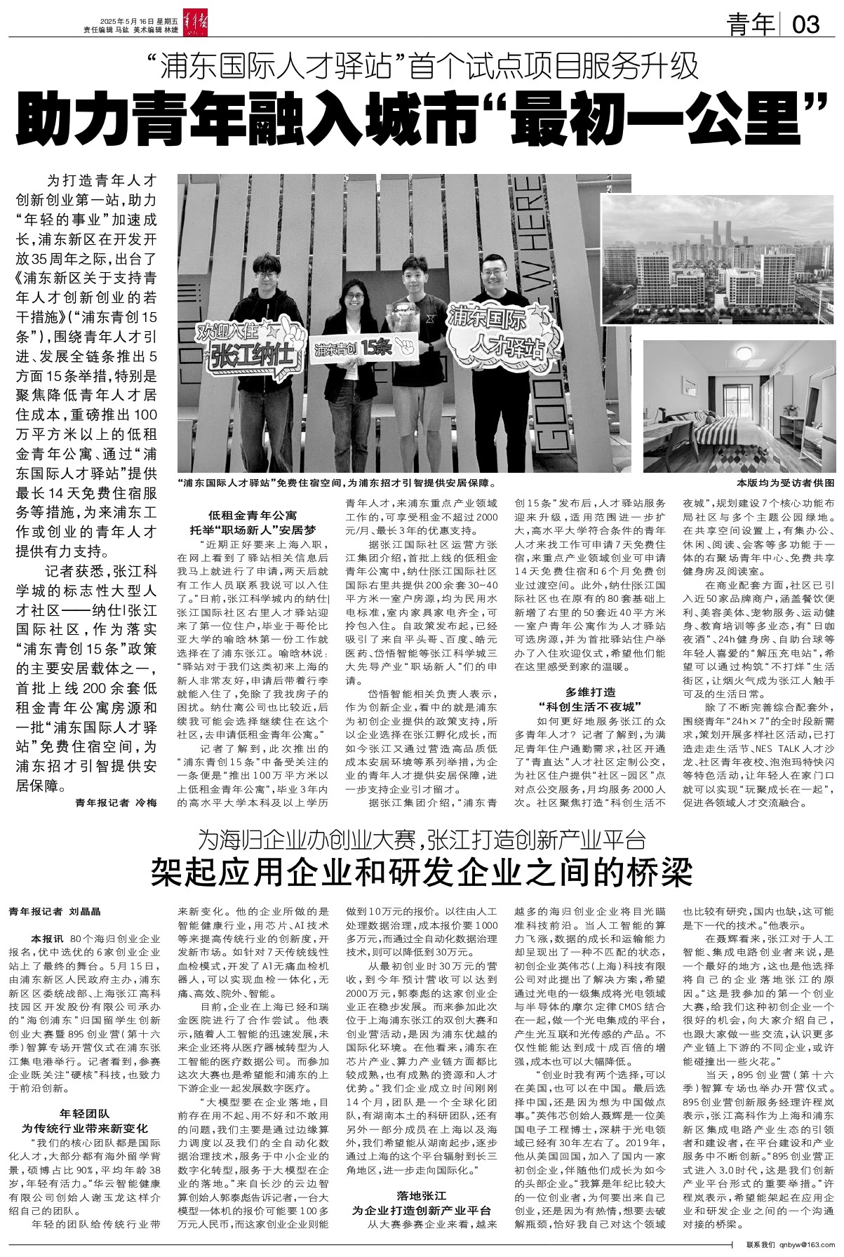 - 助力青年融入城市“最初一公里” 为打造青年人才创新创业第一站,助力“年轻的事业”加速成长,浦东新区在开发开放35周年之际,出台了《浦东新区关于支持青年人才创新创业的若干措施》(“浦东青创15条”),围绕青年人才引进、发展全