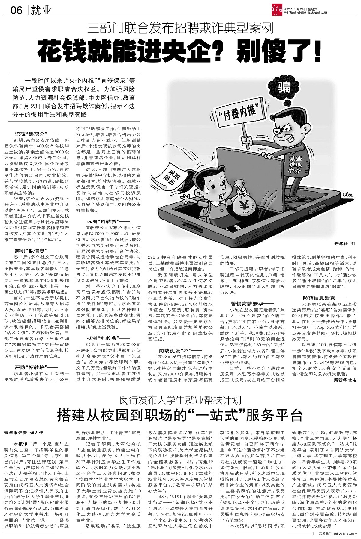 本报讯 “第一个是‘查’,应聘前先去查一下招聘单位的相关信息;第二个是‘守’,守住自己的财产,守住法律底线;第三个是‘报’,应聘过程中如果遇见不法行为要举报。”昨天下午,上海市公安局治安总队黄奕警官现身由闵行区人力资源和社会保障局联合虹桥镇人民政府主办的“闵行区大学生就业帮扶接力跑2.0计划”暨“易职+”就业服务品牌矩阵发布活动,为即将踏入社会的大学生带来一场别开生面的“毕业第一课”——“警惕求职陷阱 护航青春梦想”,深度剖析求职陷阱,呼吁青年“擦亮双眼、理性择业”。