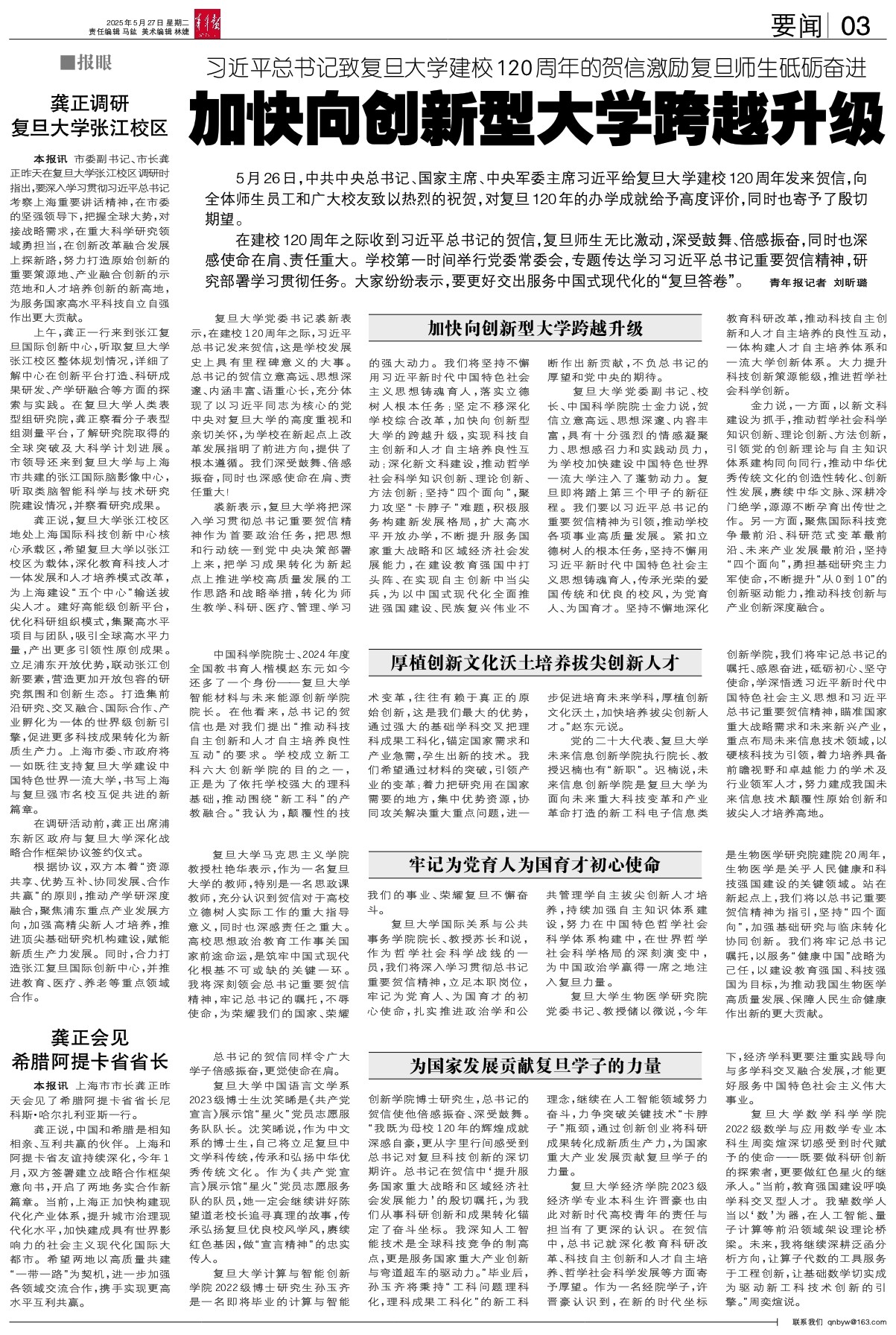 • 龚正调研复旦大学张江校区 本报讯 市委副书记、市长龚正昨天在复旦大学张江校区调研时指出,要深入学习贯彻习近平总书记考察上海重要讲话精神,在市委的坚强领导下,把握全球大势,对接战略需求,在重大科学研究领域勇担当,在创新