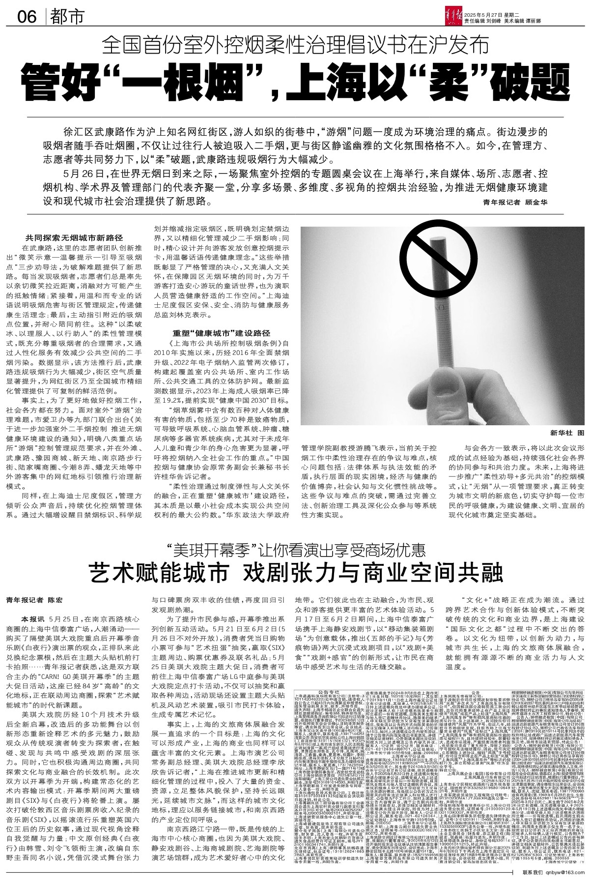 - 管好“一根烟”,上海以“柔”破题 徐汇区武康路作为沪上知名网红街区,游人如织的街巷中,“游烟”问题一度成为环境治理的痛点。街边漫步的吸烟者随手吞吐烟圈,不仅让过往行人被迫吸入二手烟,更与街区静谧幽雅的文化氛围格格不入。如今,