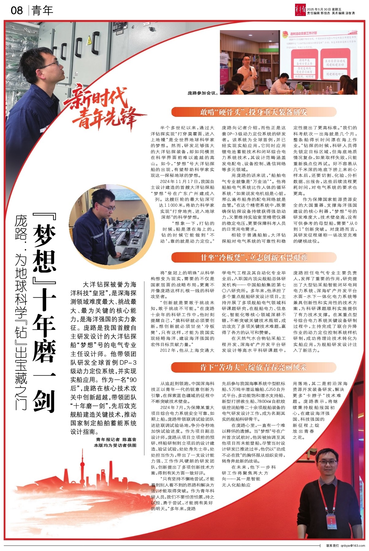 大洋钻探被誉为海洋科技“皇冠”,是深海探测领域难度最大、挑战最大、最为关键的核心能力,是海洋强国的实力象征。庞路是我国首艘自主研发设计的大洋钻探船“梦想”号的电气专业主任设计师。他带领团队研