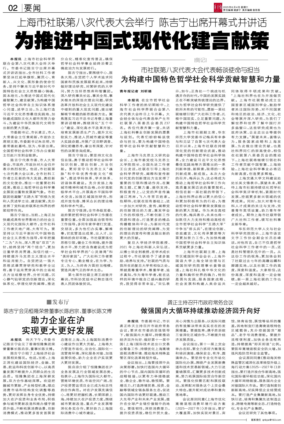 上海市社联副主席、上海市区域国别学会会长、上海外国语大学上海全球治理与区域国别研究院理事长姜锋谈道,上海社科扎根中华文化的力量和胸怀世界的魄力,特别是面向实践、服务国家战略、社会发展和构建人类命运共同体取得丰硕成果和贡献。“上海社科界也在为开放做贡献。上海市社联推动成立全国首家区域国别学会,鼓励学者关注国际形势,对不同国家和地区的政治、经济、文化、社会等展开深入研究,为我们了解世界和世界了解中国打开多扇窗口,这些研究成果也为政府决策、企业走出去等提供有力支撑。”展望未来,姜锋认为,服务国家战略和上海发展,为此做出理论贡献,也是社科界同仁的崇高使命,相信在社联第八届委员会的推动下,上海社联将继续引领社科工作者贡献中国智慧、上海经验,上海社会科学事业必将迈向新高度,创造更多辉煌。