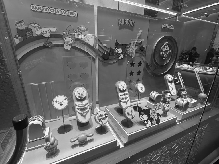 今年年初,周大福先后携手迪士尼、治愈系萌物Chiikawa(吉伊卡哇)以及备受欢迎的国产游戏《黑神话:悟空》推出联名产品。记者在环球港周大福店内看到,Chiikawa足金转运珠手链与黄金金章挂件陈列其中。店员介绍,此类联名仅在指定门店发售,上海地区仅有三家。目光所及,更有如意金箍棒足金手镯、吊坠、紧箍手镯等售价上万元的“重器”。