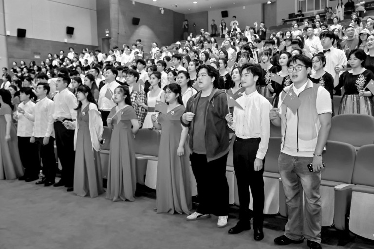 当歌会最后响起《我和我的祖国》,全场师生自发起立合唱,手中红旗整齐挥动,宛如红色海洋。这一刻,吕其明先生毕生追求的四个梦想,在这首承载了师生深情的歌声中得到了最生动的诠释。