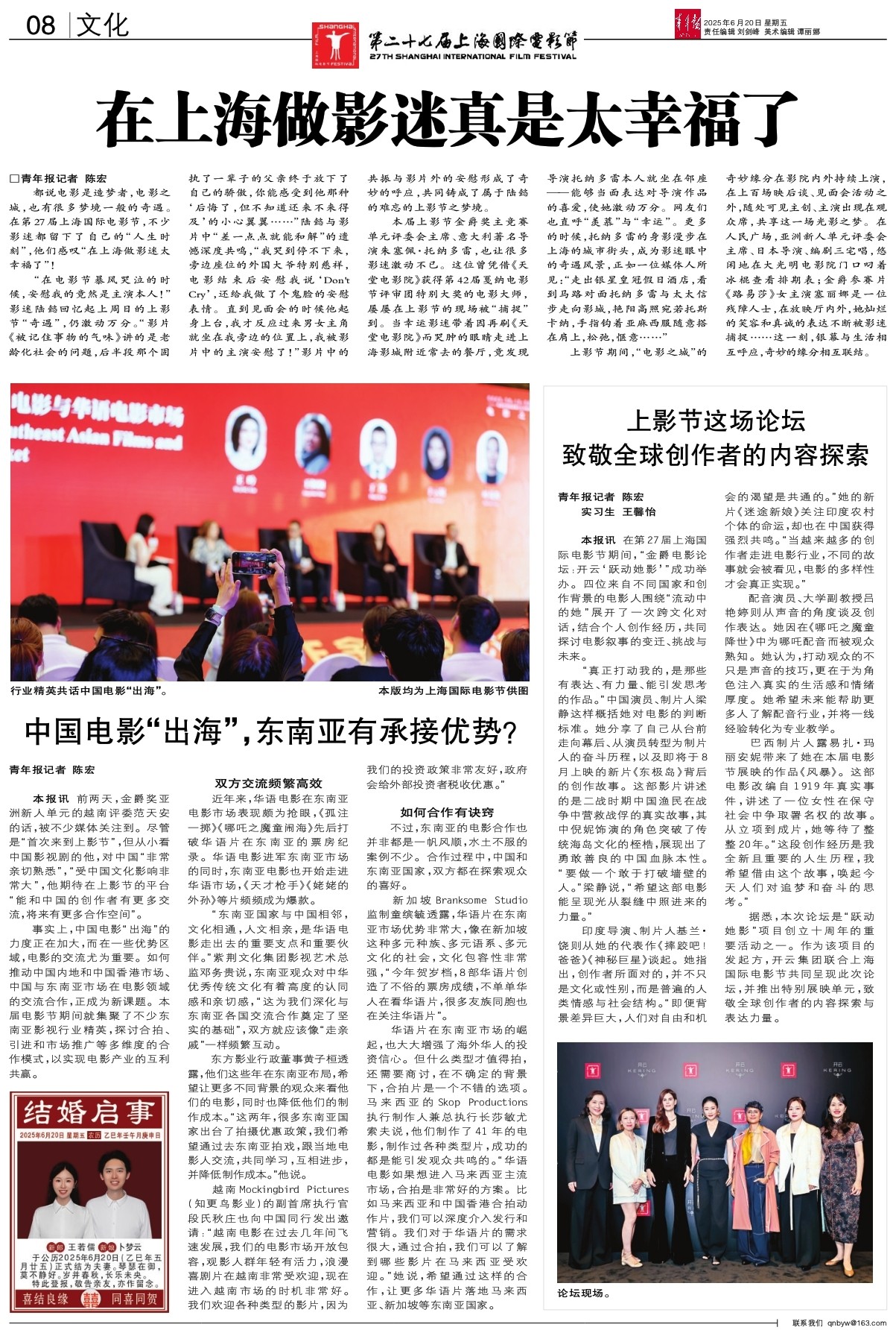 - 中国电影“出海”,东南亚有承接优势? 青年报记者 陈宏 本报讯 前两天,金爵奖亚洲新人单元的越南评委范天安的话,被不少媒体关注到。尽管是“首次来到上影节”,但从小看中国影视剧的他,对中国“非常亲切熟悉”,“受中国文化影