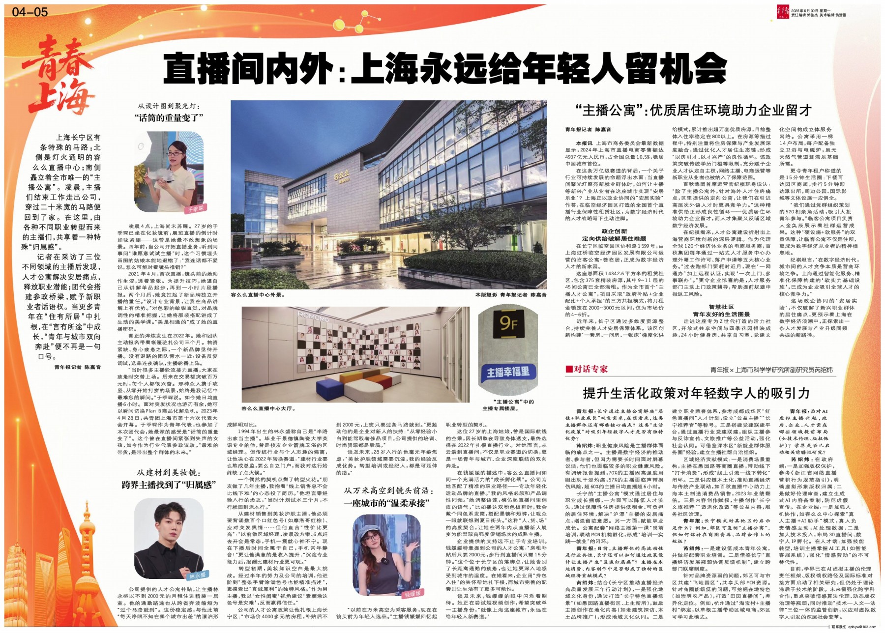 青年报:长宁通过主播公寓解决“居住+职业成长”双重需求,在您看来,这类主播群体还有哪些核心痛点?这类“生活化政策”对吸引年轻数字人才是否有独特优势?