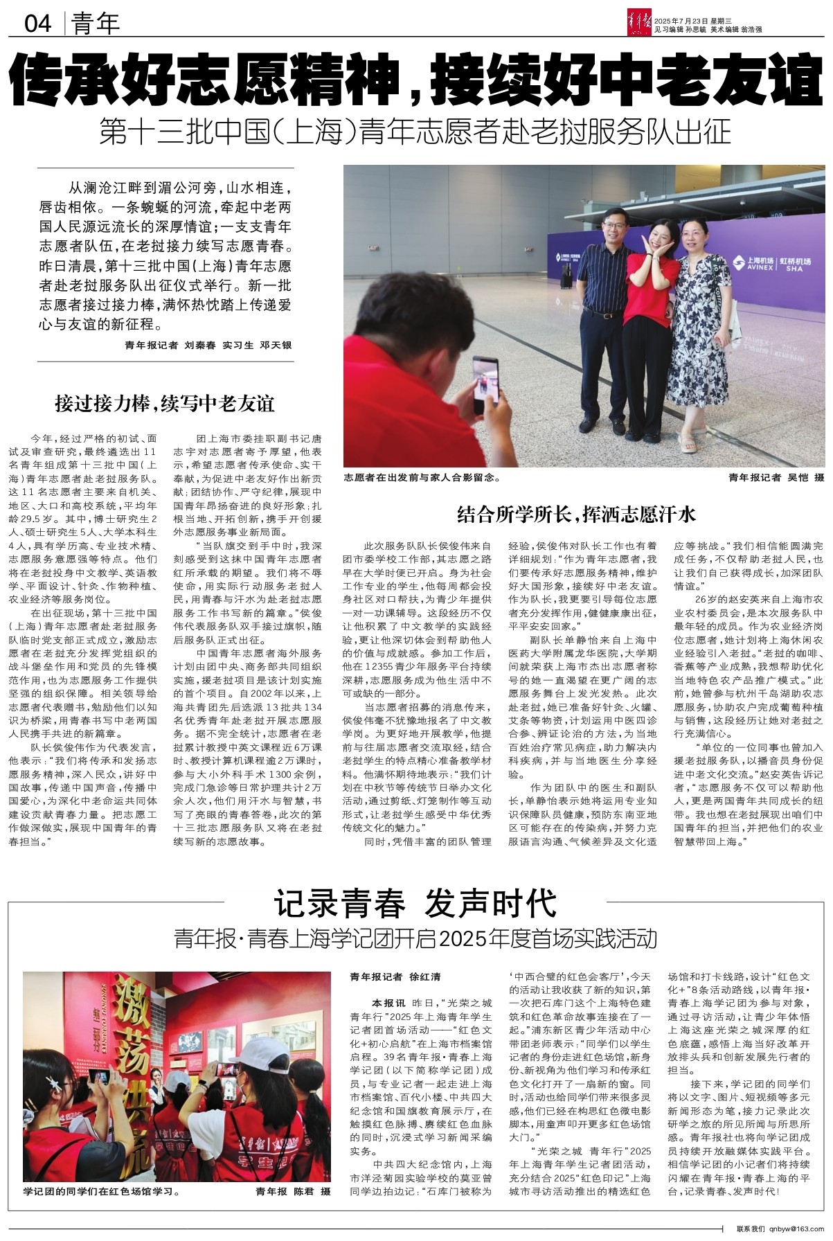 本报讯 昨日,“光荣之城 青年行”2025年上海青年学生记者团首场活动——“红色文化+初心启航”在上海市档案馆启程。39名青年报·青春上海学记团(以下简称学记团)成员,与专业记者一起走进上海市档案馆、百代小楼、中共四大纪念馆和国旗教育展示厅,在触摸红色脉搏、赓续红色血脉的同时,沉浸式学习新闻采编实务。