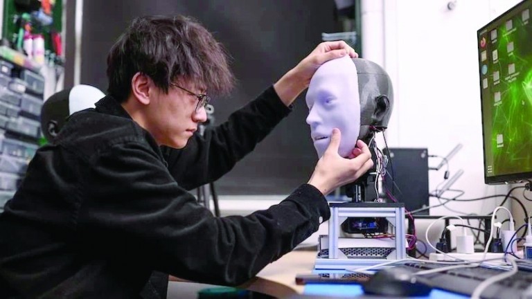 训练过程充满巧思。团队开发独特“对镜学习”,机器人像婴儿用摄像头观察自己挤眉弄眼,捕捉皮肤非线性运动奥秘。“传统机械臂是刚体运动,人脸却是无数微动作耦合,必须让AI学习人类肌肉‘语言’。”