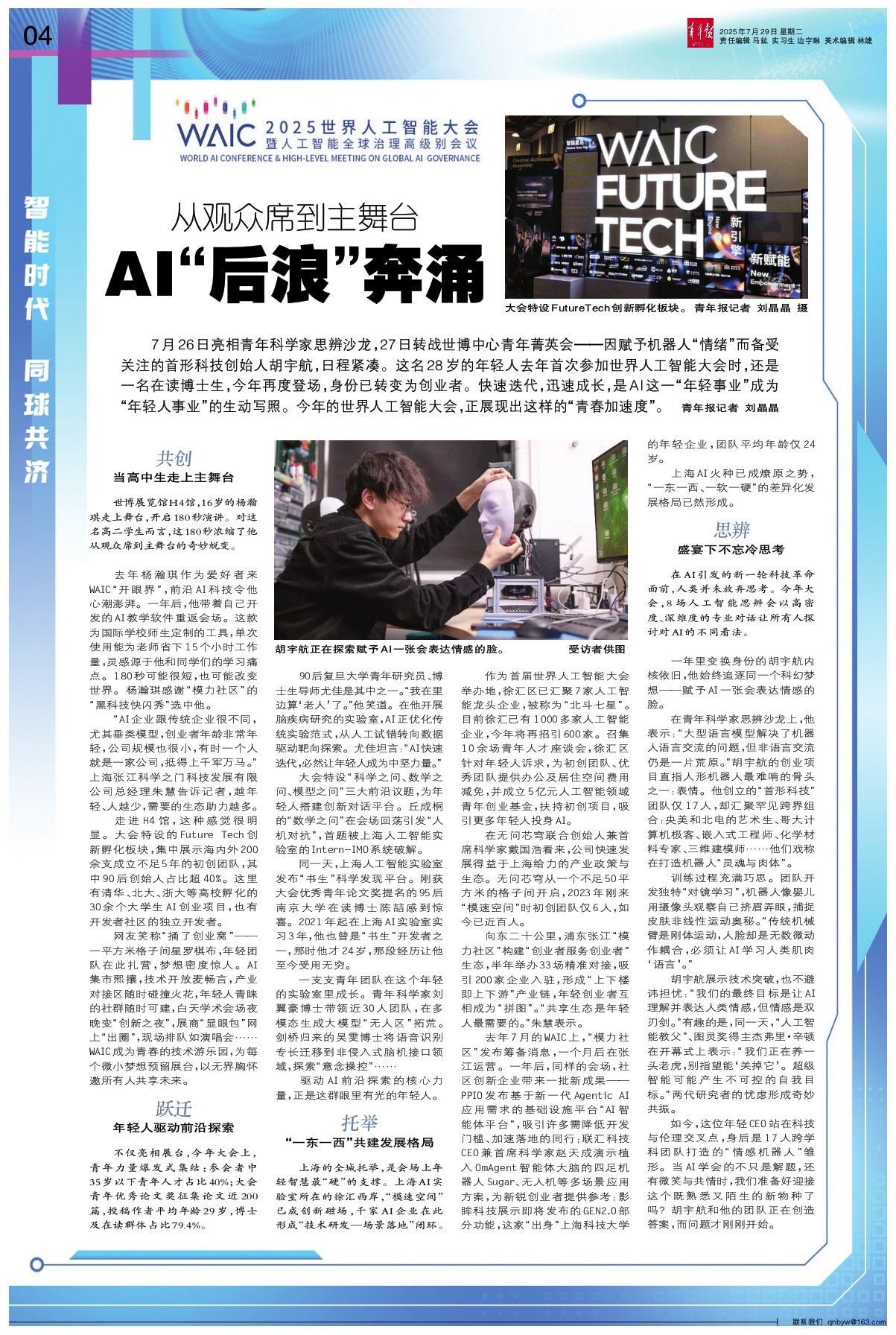 7月26日亮相青年科学家思辨沙龙,27日转战世博中心青年菁英会——因赋予机器人“情绪”而备受关注的首形科技创始人胡宇航,日程紧凑。这名28岁的年轻人去年首次参加世界人工智能大会时,还是一名在读博士生,今年再度登场,身份已转变为创业者。快速迭代,迅速成长,是AI这一“年轻事业”成为“年轻人事业”的生动写照。今年的世界人工智能大会,正展现出这样的“青春加速度”。