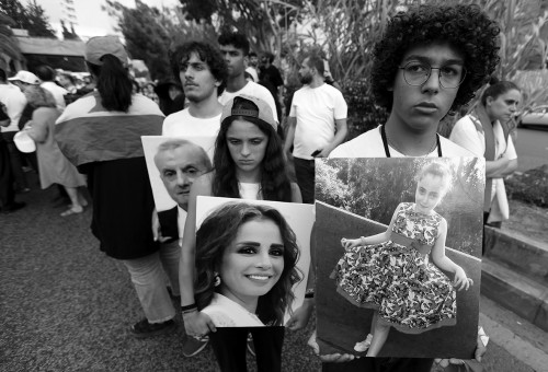 8月4日,在黎巴嫩首都贝鲁特,人们携受害者照片参加贝鲁特港口爆炸事件五周年纪念活动。2020年8月4日,贝鲁特港口因存放的近3000吨硝酸铵被引燃发生大爆炸,造成200多人死亡、6500多人受伤。 新华社 图