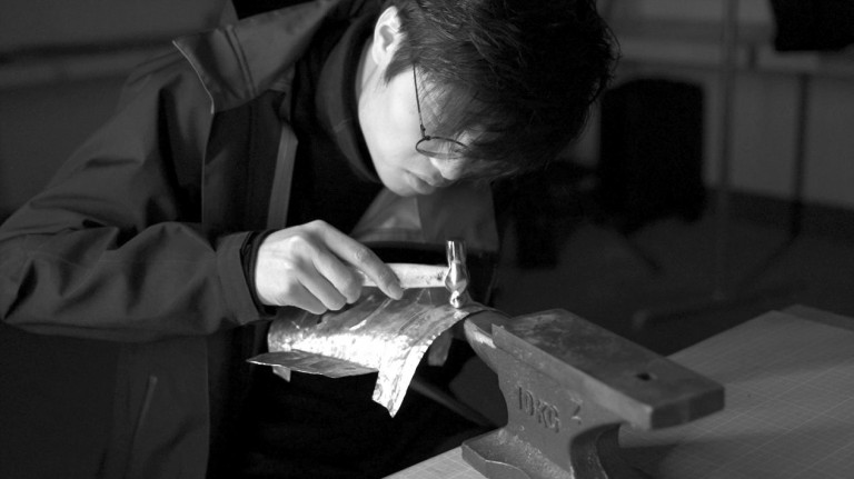 将500克金条(长10厘米、宽3厘米、厚约1.2厘米),纯手工捶打成比A4纸更大、薄至0.3~0.4毫米的金片,谈何容易?锤揲,这门古老的金属加工技艺,充分利用黄金的延展性,极度考验匠人的耐性。煅烧、捶打、敲击,循环往复。举起重达1.8千克的锤子,一手扶稳金条,“才浅”感到一种奇妙的连接——仿佛指尖触到了三千年前那名无名工匠的心跳。