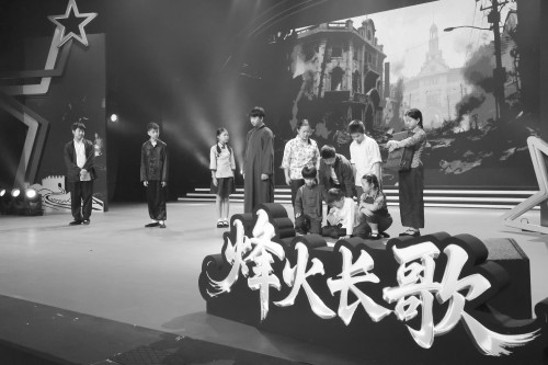 第二篇章《薪火永传》凸显抗战的力量与精神的传承。小荧星艺术团演绎的《烽火摇篮 童声战号》,再现了战争年代上海孩子们的勇敢与智慧。他们虽身处难民收容所,仍以童声吹响抗战的号角。