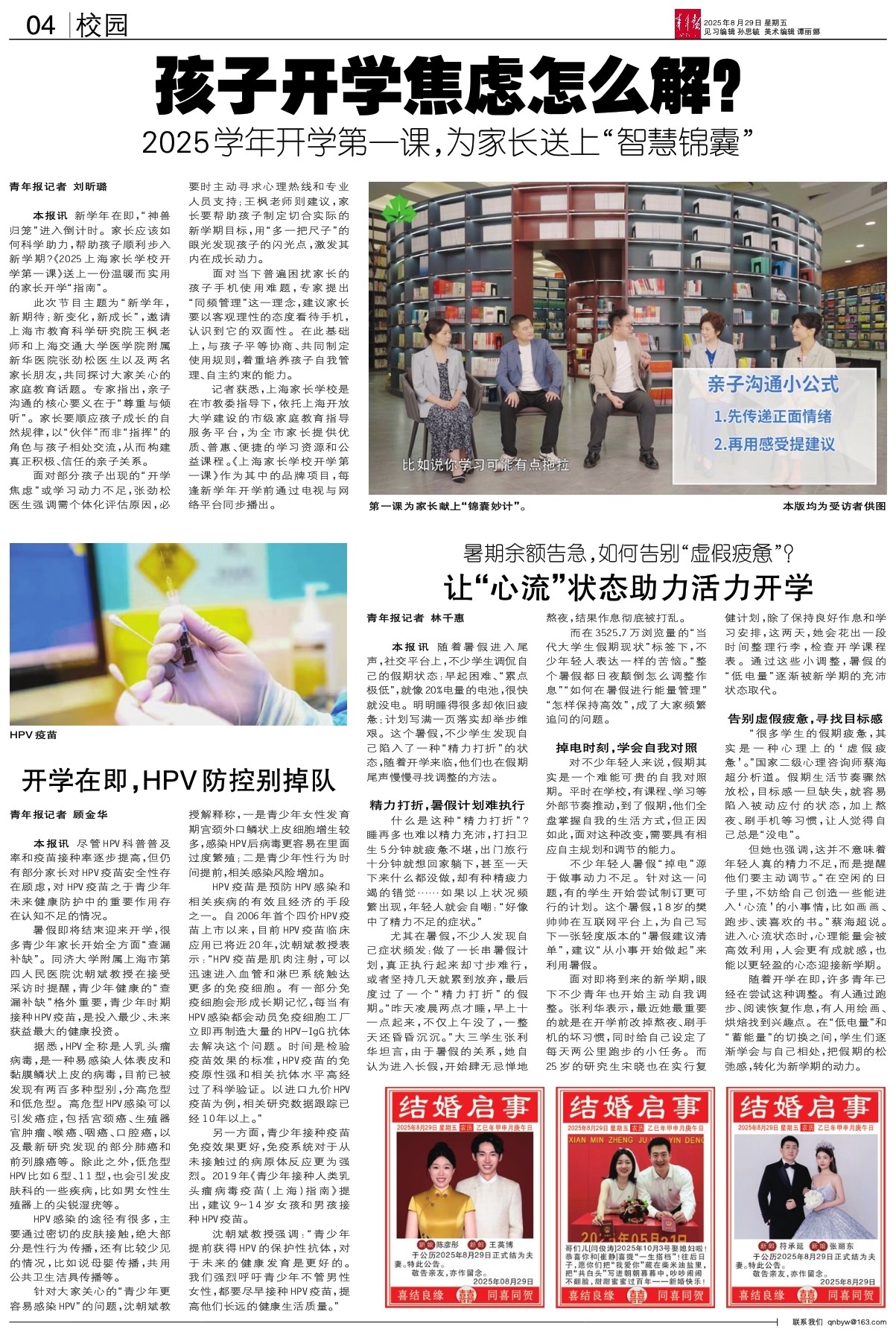 - 孩子开学焦虑怎么解? 青年报记者 刘昕璐 本报讯 新学年在即,“神兽归笼”进入倒计时。家长应该如何科学助力,帮助孩子顺利步入新学期?《2025上海家长学校开学第一课》送上一份温暖而实用的家长开学“指南”