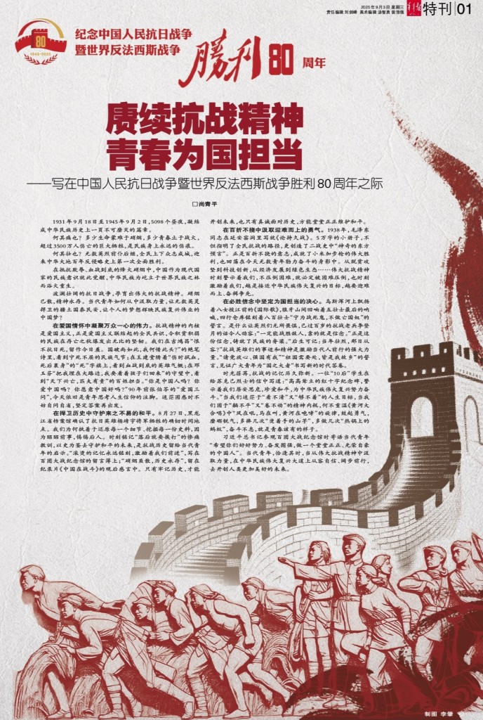 在爱国情怀中凝聚万众一心的伟力。抗战精神的内核是爱国主义,正是爱国主义联结起的全民共识,令积贫积弱的民族在存亡之秋爆发出无比的坚韧。我们在吉鸿昌“恨不抗日死,留作今日羞。国破尚如此,我何惜此头?”的绝笔诗里,看到宁死不屈的民族气节;在王建堂绣着“伤时拭血,死后裹身”的“死”字旗上,看到血战到底的英雄气概;在邓玉芬“把我埋在大路边,我要看着孩子们回来”的守望中,看到“天下兴亡,匹夫有责”的百姓担当。“你是中国人吗?你爱中国吗?你愿意中国好吗?”90年前张伯苓的“爱国三问”,今天依旧是青年思考人生信仰的注脚。迷茫困惑时不妨自问自省,坚定答案再出发。