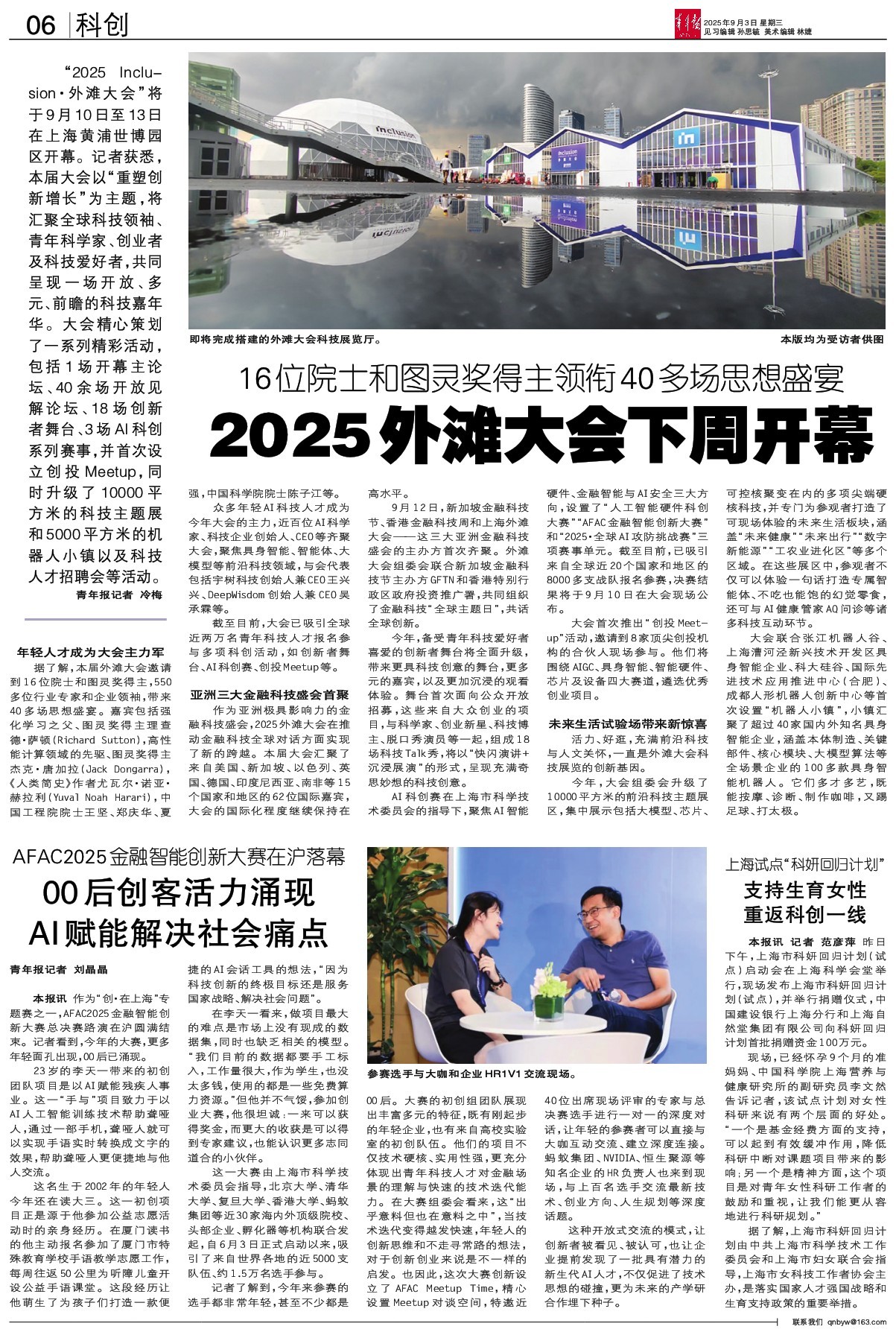 - 2025外滩大会下周开幕 “2025 Inclu-sion·外滩大会”将于9月10日至13日在上海黄浦世博园区开幕。记者获悉,本届大会以“重塑创新增长”为主题,将汇聚全球科技领袖、青年科学家、创业者及科技爱好者,共同