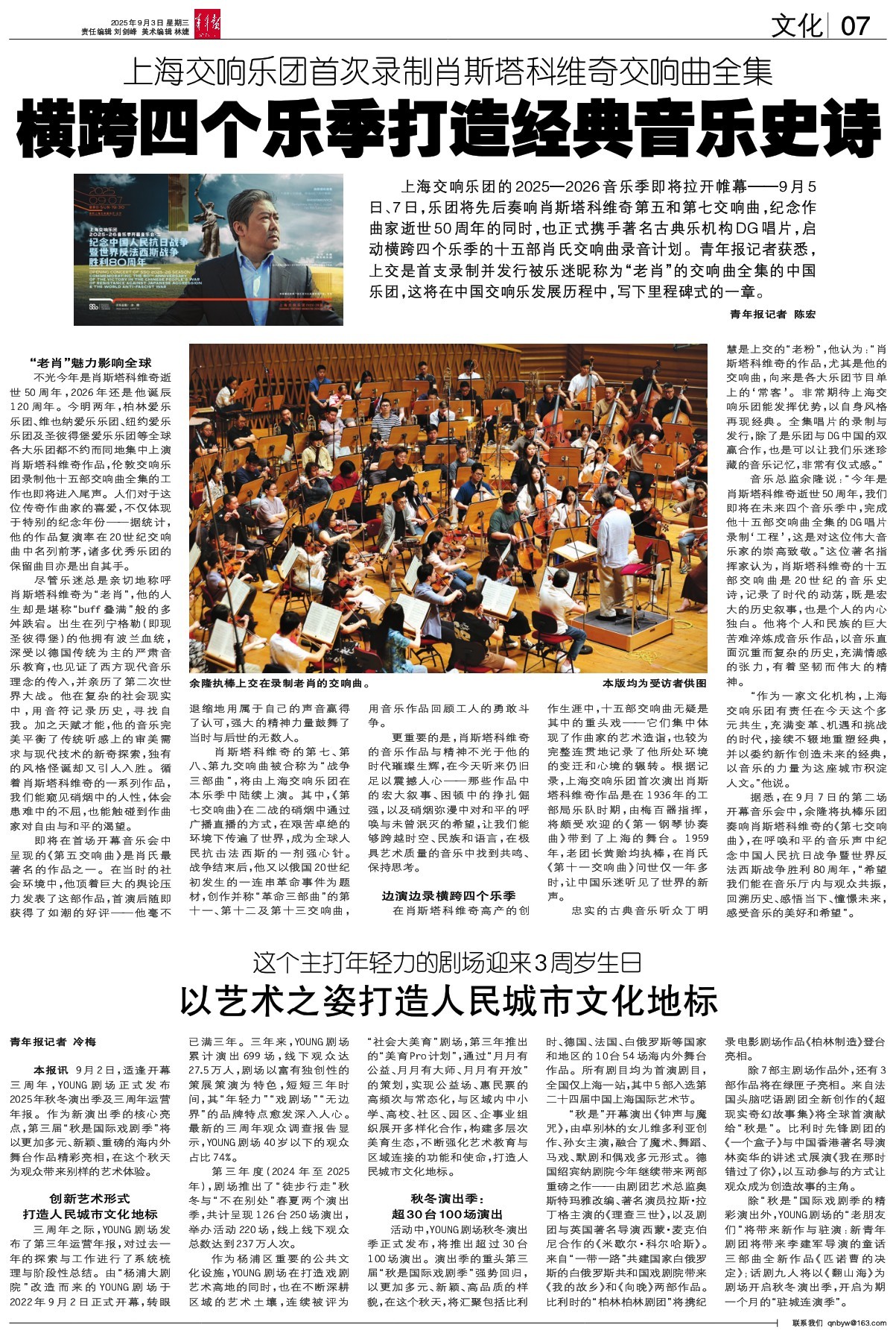 - 横跨四个乐季打造经典音乐史诗 上海交响乐团的2025—2026音乐季即将拉开帷幕——9月5日、7日,乐团将先后奏响肖斯塔科维奇第五和第七交响曲,纪念作曲家逝世50周年的同时,也正式携手著名古典乐机构DG唱片,启动横跨四个
