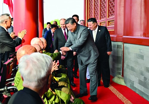 上午8时35分,习近平同出席大会的外方代表团团长拾级而上,登上天安门城楼。习近平同抗战老战士老同志代表亲切握手,向他们表示崇高敬意。