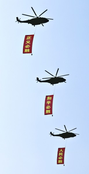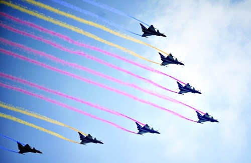 空军八一飞行表演队驾驶歼-10表演机,以超密集编队出场。7架战机在空中划出14道彩烟,寓意着中华民族14年可歌可泣的抗战历程,象征着14亿多中国人民奔向强国复兴的绚丽前景。