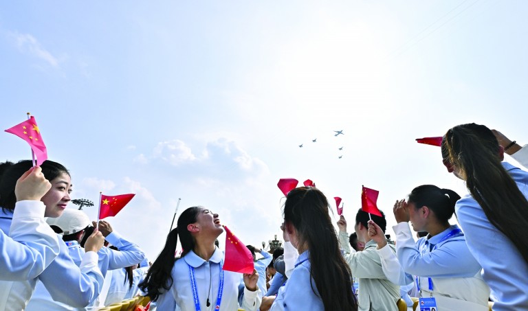 9月3日上午,歼击机梯队飞过天安门广场上空,接受祖国和人民检阅。