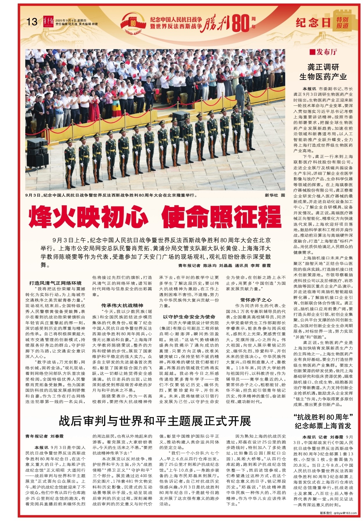 本报讯 9月3日是中国人民抗日战争暨世界反法西斯战争胜利80周年纪念日,在这个意义重大的日子,上海淞沪抗战纪念馆“正义昭昭 大道同行——战后审判与世界和平主题展览”正式面向公众展出。上午,淞沪抗战纪念馆就迎来了不少观众,他们中有从四行仓库跑步25公里到纪念馆的跑友,有看完阅兵直播后前来缅怀先烈的周边居民,也有从外地赶来的游客。看完展览,大家纷纷表示,今天的生活来之不易,“要把抗战精神传承下去!”