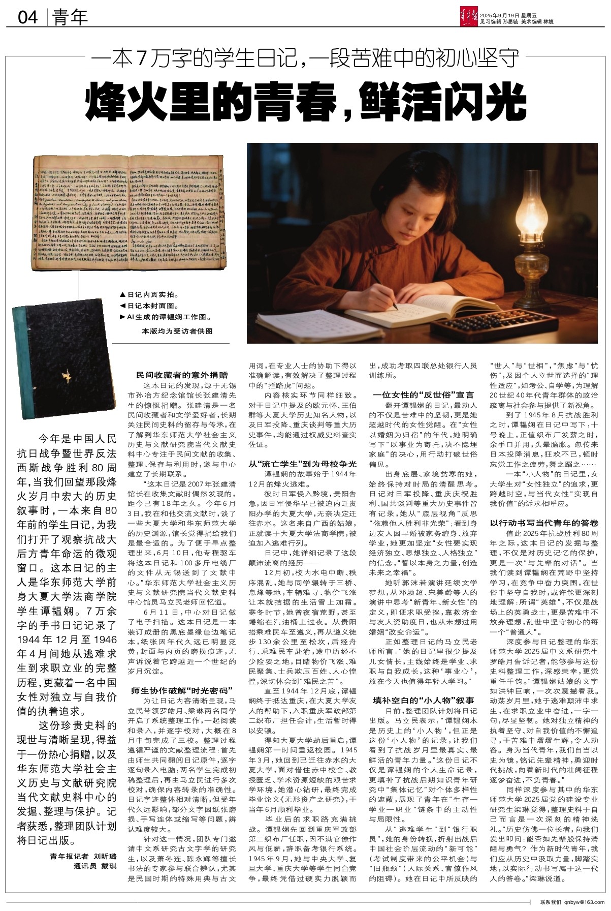 深度参与日记整理的华东师范大学2025届中文系研究生罗皓月告诉记者,能够参与这份史料整理工作,深感荣幸,更觉重任千钧。“谭韫娴姑娘的文字如洪钟巨响,一次次震撼着我。动荡岁月里,她于逃难颠沛中求生,在求职立业中奋进,一字一句,尽显坚韧。她对独立精神的执着坚守、对自我价值的不懈追寻,于苦难中熠熠生辉,令人动容。身为当代青年,我们自当以史为镜,铭记先辈精神,勇迎时代挑战,向着新时代的壮阔征程逐梦奋进,不负青春。”