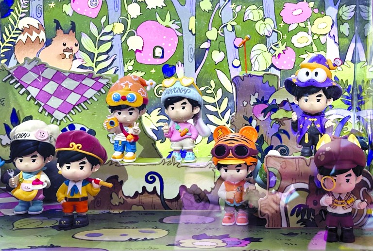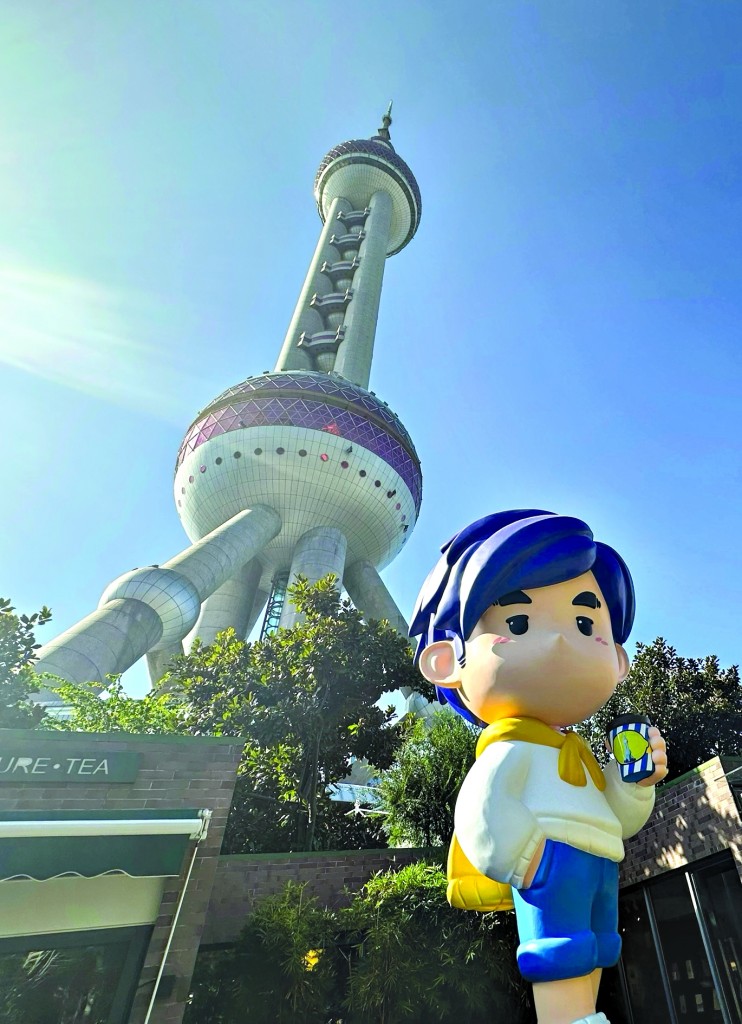 在上海的城市空间里,偶像的形象不只是舞台投影,更是城市青春经济的参与者。周杰伦的二次元形象“周同学”,以粗眉毛、嘟嘟脸的形象潜入上海街头,成为连接偶像与粉丝的情感符号。其形象雕塑既现身各大地标,成为粉丝和路人的打卡背景,又在快闪店成为符号标志,变成手办、盲盒公仔和徽章上的图案。记者在明珠生活美学咖啡馆看到,不少粉丝或在给“周同学”玩偶公仔拍照,或在挑选主题盲盒。