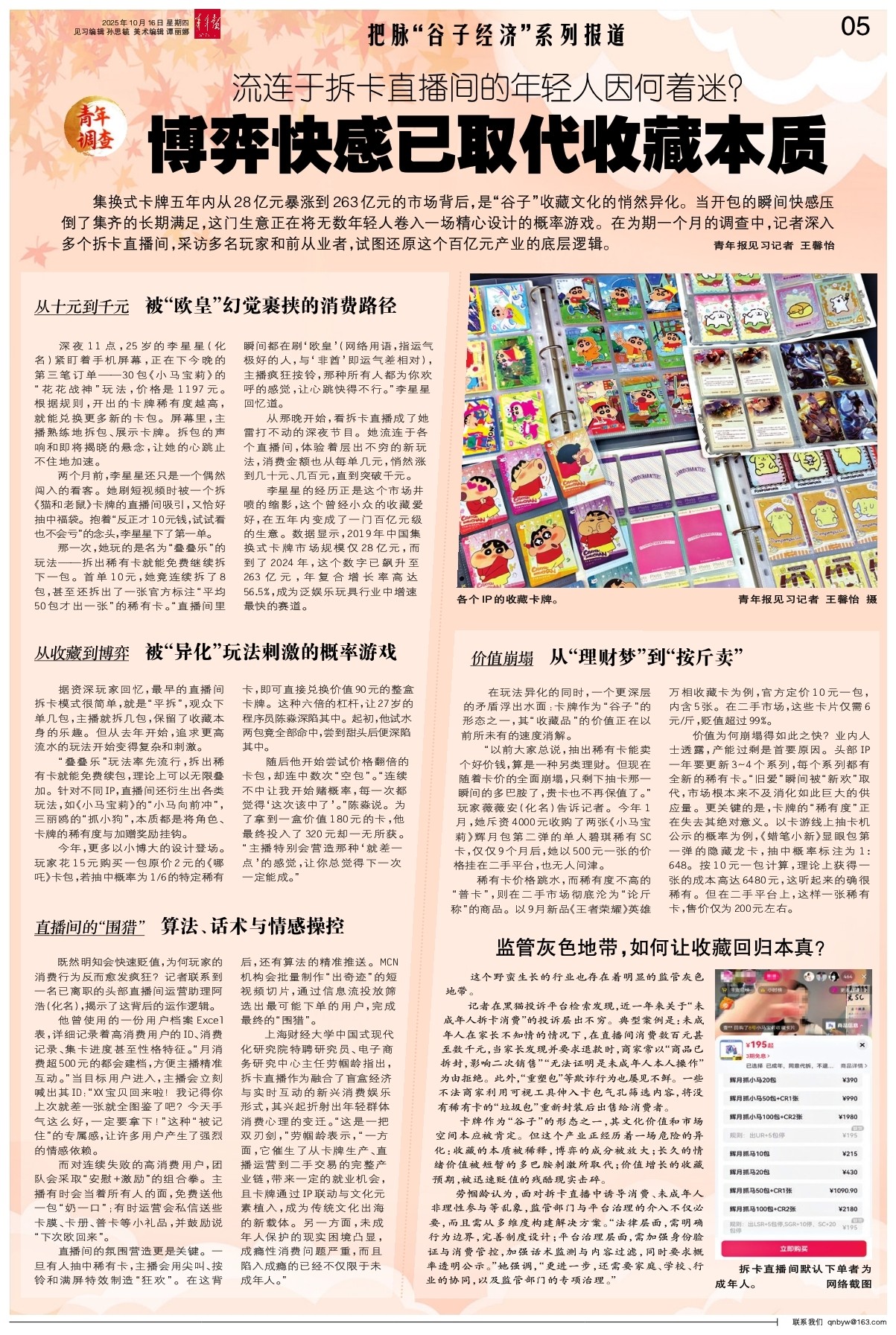 集换式卡牌五年内从28亿元暴涨到263亿元的市场背后,是“谷子”收藏文化的悄然异化。当开包的瞬间快感压倒了集齐的长期满足,这门生意正在将无数年轻人卷入一场精心设计的概率游戏。在为期一个月的调