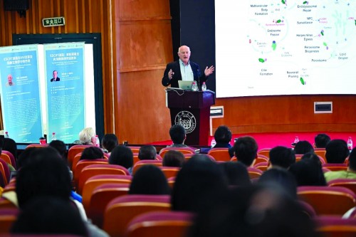 如果说埃默尔教授的研究聚焦“细胞自身的运作”,韦斯·桑德奎斯特教授则将视角转向“病毒与细胞的相互作用”。他是HIV研究领域的世界级权威,尤其以其在理解HIV如何从宿主细胞中“出芽”和释放的分子机制方面的开创性研究而闻名。在他的分享中,同学们感受最多的是他对基础研究的热爱。报告中,他多次强调:“基础研究的每一点突破,都可能成为对抗疾病的重要武器。”