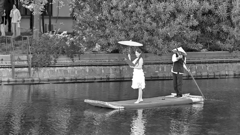 “丽娃河时光”主题打卡点前,师生纷纷驻足,“过去的丽娃河上,师生竟然可以泛舟,太有意思了!”00后大学生看着老照片不禁互相攀谈起来,也用镜头记录下如今的美好瞬间。