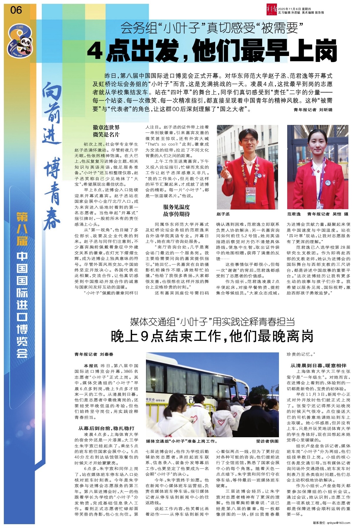 上午工作至送离嘉宾,下午又投入论坛指引,忙碌而充实的工作让赵子丞深感意义非凡。“我的工作虽小,但无数个这样的环节汇聚起来,才成就了进博会的精彩。每一片‘小叶子’,都是一张温暖名片。”他说。