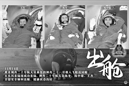 14日16时40分,神舟二十一号载人飞船返回舱在东风着陆场成功着陆。返回舱舱门打开后,神舟二十号航天员陈冬、陈中瑞、王杰安全顺利出舱,健康状态良好。