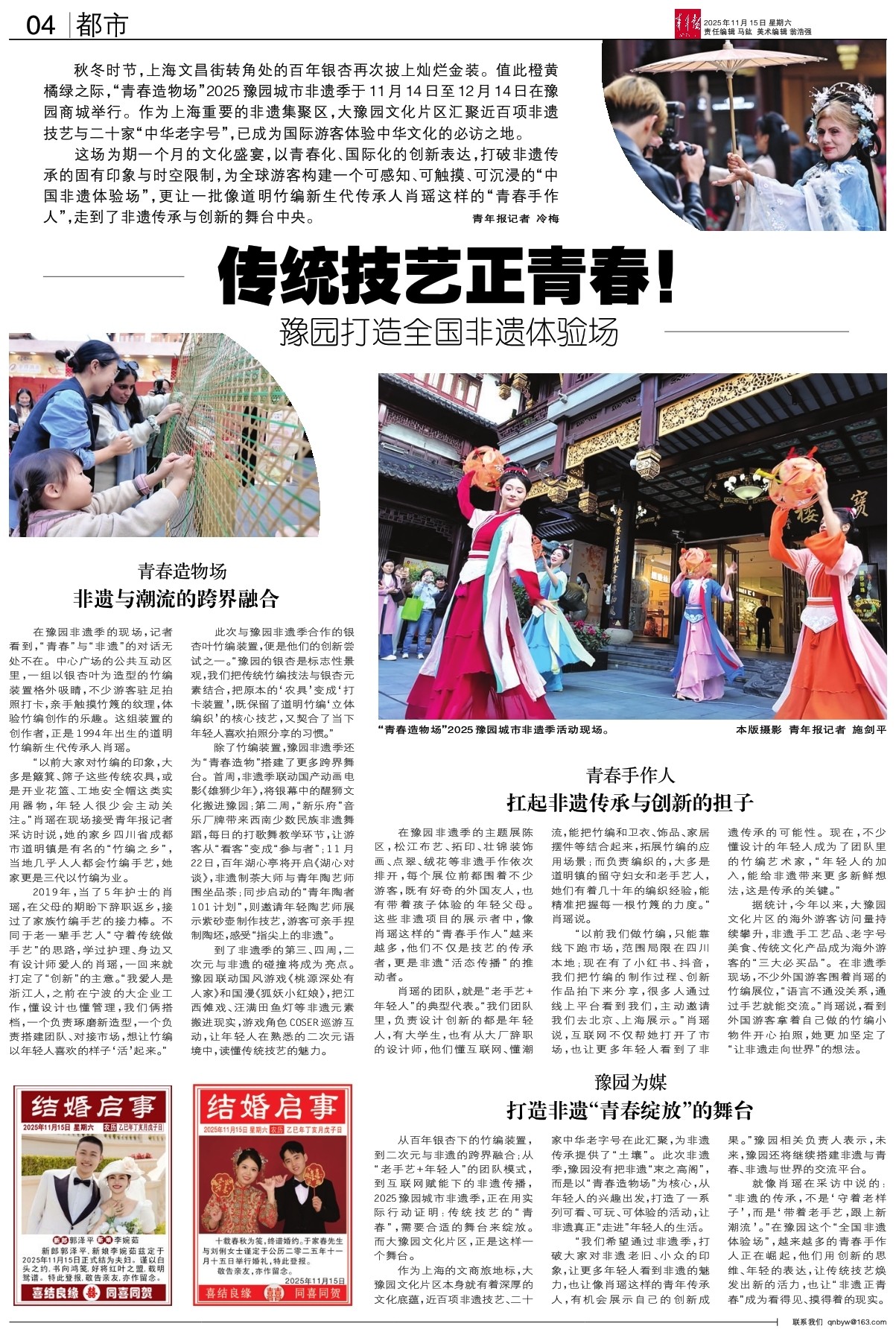 秋冬时节,上海文昌街转角处的百年银杏再次披上灿烂金装。值此橙黄橘绿之际,“青春造物场”2025豫园城市非遗季于11月14日至12月14日在豫园商城举行。作为上海重要的非遗集聚区,大豫园文化片