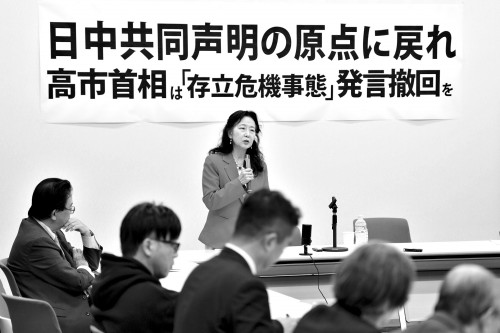 集会主题为“要求高市首相撤回‘存亡危机事态’相关言论,回到日中邦交正常化的原点”。日本前外务省官员孙崎享指出,高市的发言破坏了1972年《中日联合声明》。日本青山学院大学名誉教授羽场久美子表示,高市的涉台言论极其危险,明显违反日本国宪法第九条,同时也违反国际法。