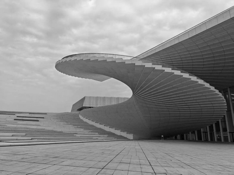 在集中视察中,记者了解到,项目造型取“中国扇”之意,建筑屋面如同一把展开的中国扇,自然形成螺旋楼梯,结合歌剧艺术的动态美感,巨大的白色阶梯呈螺旋状上升,延伸到空中,恰似打开的折扇,尽显中国风之美。